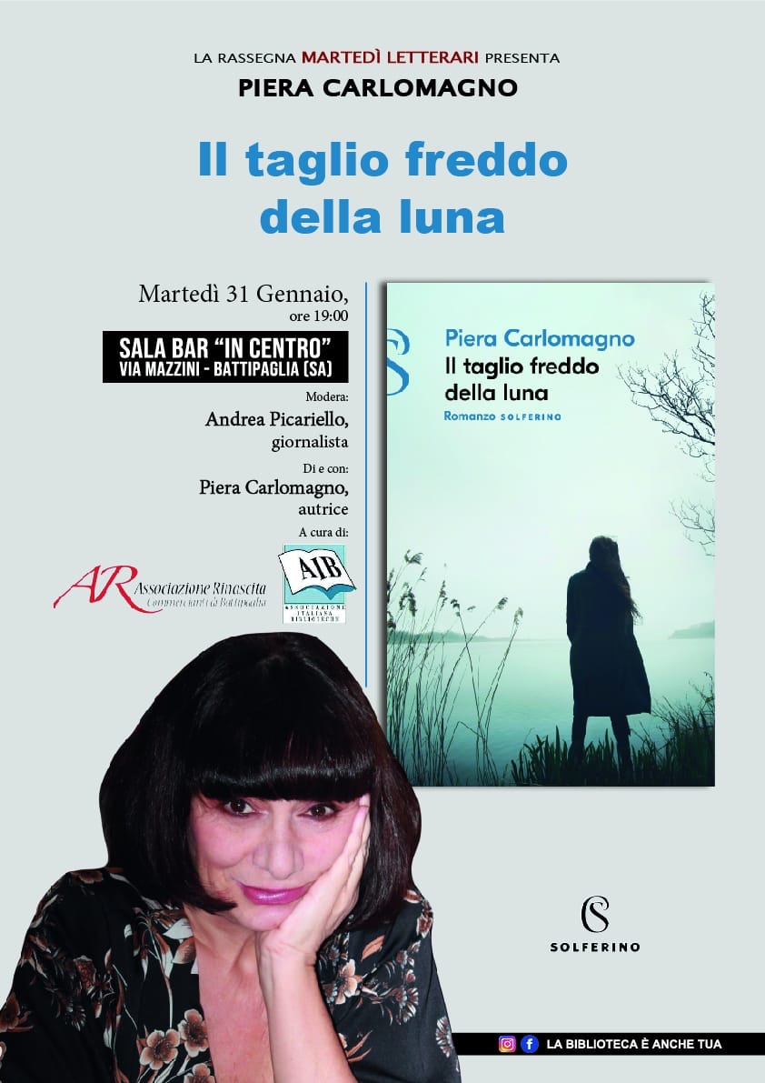 Nuovo appuntamento, il primo del 2023, con la rassegna “Martedì Letterari”, organizzata dall’Associazione “Rinascita – Commercianti di Battipaglia”, presieduta da Lucia Ferraioli, coordinata dal giornalista Andrea Picariello e rientrante all’interno del format “La biblioteca è anche tua”. L’appuntamento previsto per il mese di gennaio vedrà ospite Piera Carlomagno, giornalista e scrittrice che presenterà il romanzo “Il taglio freddo della luna”, edito da Solferino.