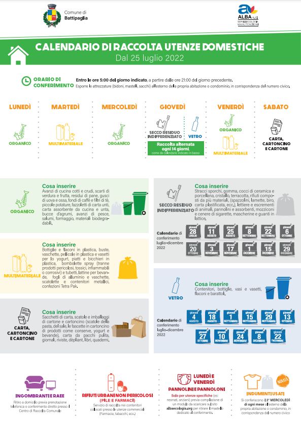Raccolta differenziata, rivoluzione in casa Alba: ecco il nuovo calendario di conferimento dei rifiuti che sarà attivo a partire dal prossimo 25 luglio.